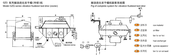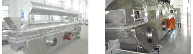 物料自進(jìn)料進(jìn)口進(jìn)入機(jī)內(nèi),在振動(dòng)力作用下,物料沿水平面流化床拋擲,向前連續(xù)運(yùn)動(dòng),熱風(fēng)向上穿過流化床同濕物料換熱后,濕空氣經(jīng)旋風(fēng)分離器除塵后由排風(fēng)1:3排出.干燥物料由排料進(jìn)口排出。